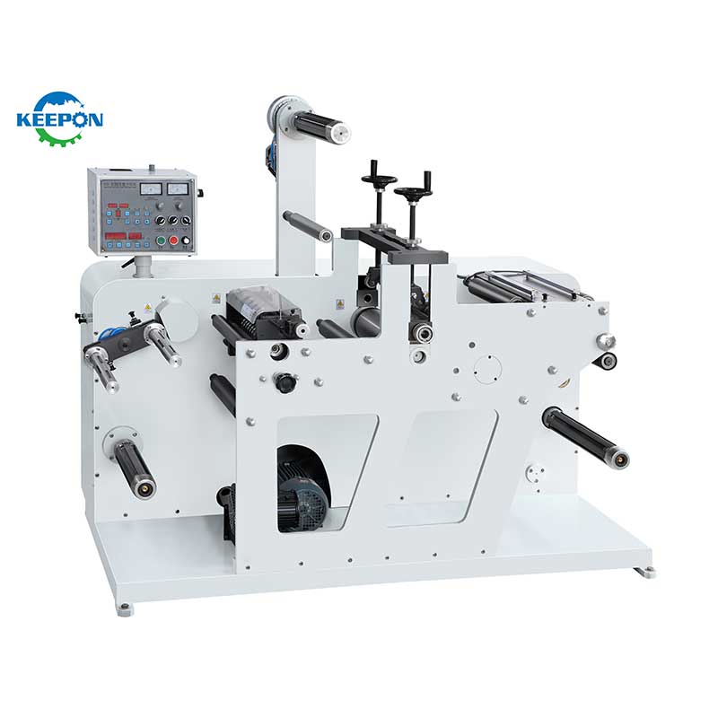 DK-320G Slitting machine with rotary die-cutting unit is a new product produce by KEEPON. It equipped with high precision rotary die-cutting system.This machine suit for blank adhesive labels die cutting and slitting in one process. This slitter rewinder has the function of automatic meter or piece counting, auto-stop, web guiding by photocell.